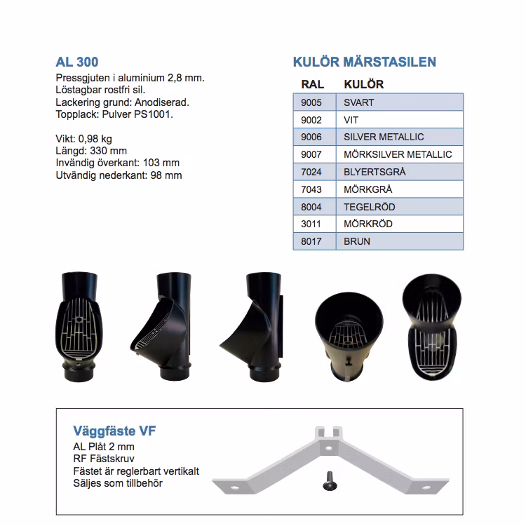 Tillverkad i pressgjuten aluminium, 2.8 mm tjocklek för överlägsen hållbarhet. Kombinerat med ett väggfäste som gör att silen sitter i fixerat läge. Lövsilen säljes i lackerat utförande i ett antal olika kulörer.